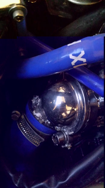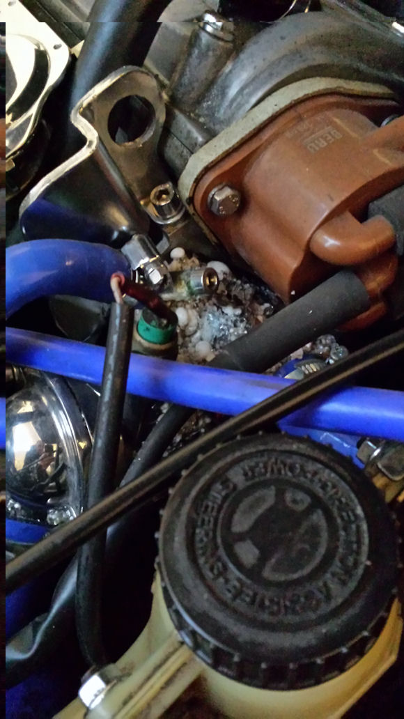sieht aus als ist das Wassergehäuse undicht. Das Kühlwasser blüht dort aus.