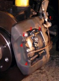 Zum Wechseln der Beläge benötigt ihr eigentlich außer einem kleinen Spitzen Gegenstand wie einem Nagel oder Schraubendreher und einem kleinen Hamemr nichts weiter. Zum Wechseln der Scheiben braucht ihr noch zusätzlich einen Schlagschrauber oder großen Kreuzschlitzschraubendreher bzw. besser noch einen Aufsatz für eine Ratsche und eine Drahtbürste. Je nach Verschmutzungsgrad des Bremssattels, könnt ihr diesen mit Hilfe von Bremsenreiniger etwas saubermachen. Zum Demontieren der Beläge löst ihr zunächst die Räder und trennt dann die Verbindung der Verschleißanzeige (1). Diese einfach rausziehen. Dann nehmt ihr vorsichtig die Federn (2) heraus und drückt die Klammer (3) nach oben. Anschließen noch die beiden Halterungsstifte (4) herausdrücken und schon sollten die Brembeläge einigermaßen locker sein. Je nachdem, wie weit eure Scheiben(Beläge abgefahren sind, kann es sein, daß diese beim Versuch diese nach oben herauszuziehen verkannten. In diesem Fall einfach mit einem kleinen Hammer mit etwas Gewalt nachhelfen. |