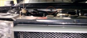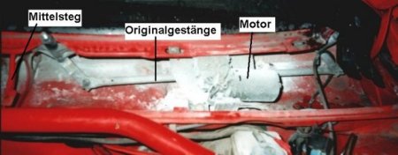 Am unteren linken Rand des Gestänges vom Citroen befindet sich eine eingeschweißte Mutter. Diese eignet sich hervorragend zum befestigen an der Spritzwand. Dazu das Gestänge provisorisch anhalten und dann vom Motorraum aus, ein Loch in die Spitzwand bohren und eine passende Schraube montieren. Achtet darauf, daß sich das Gelenk vom Wischerarm einmal komplett drehen kann, ohne irgendwo anzustoßen! Erst dann bohren! |